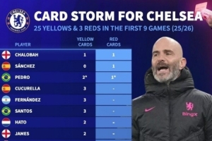 体育资讯10月1日讯 德国转会市场统计,切尔西新赛季前9场比赛,领到25张黄牌和3张红牌。