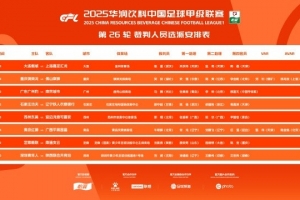 体育资讯10月11日讯 2025华润饮料中甲联赛第26轮裁判选派结果公布,重庆铜梁龙vs佛山南狮、青岛红狮vs广西平果两场比赛安排有VAR裁判。
