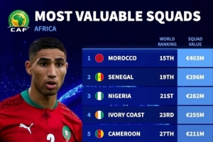 非洲国家队身价榜:摩洛哥4.03亿欧领跑,塞内加尔、尼日利亚前三