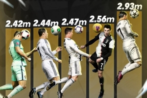 C罗职业生涯至今最高5次跳跃(头部高度):