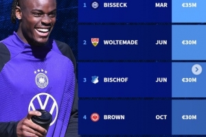 体育资讯10月16日讯 德国转会市场盘点了足球强国2025年上演首秀的球员,德国共5名球员上演首秀,这包括了比塞克、沃尔特马德。